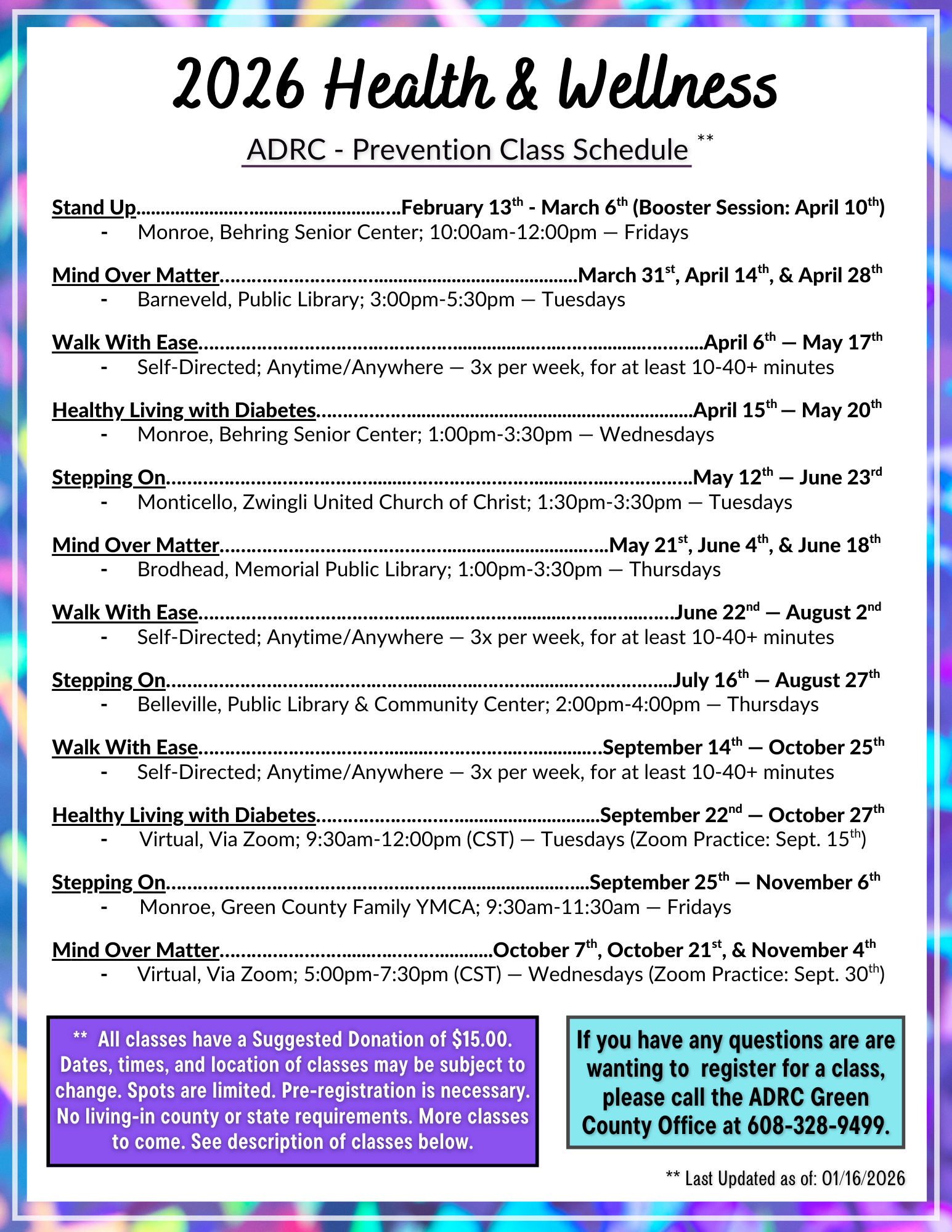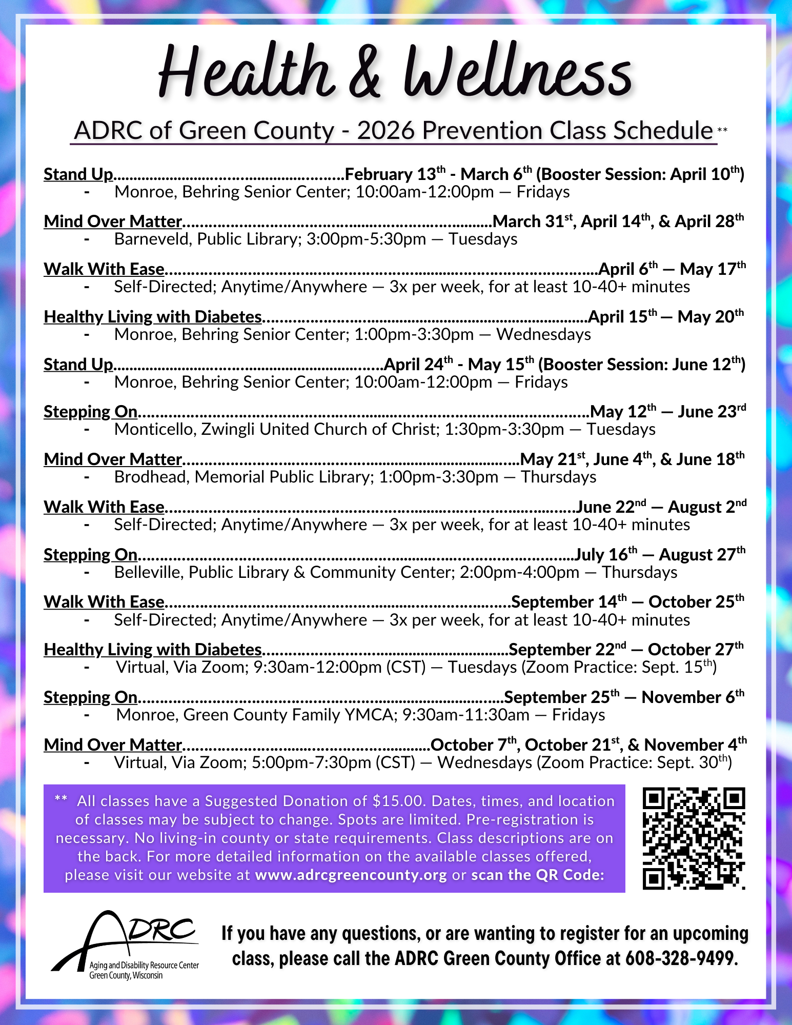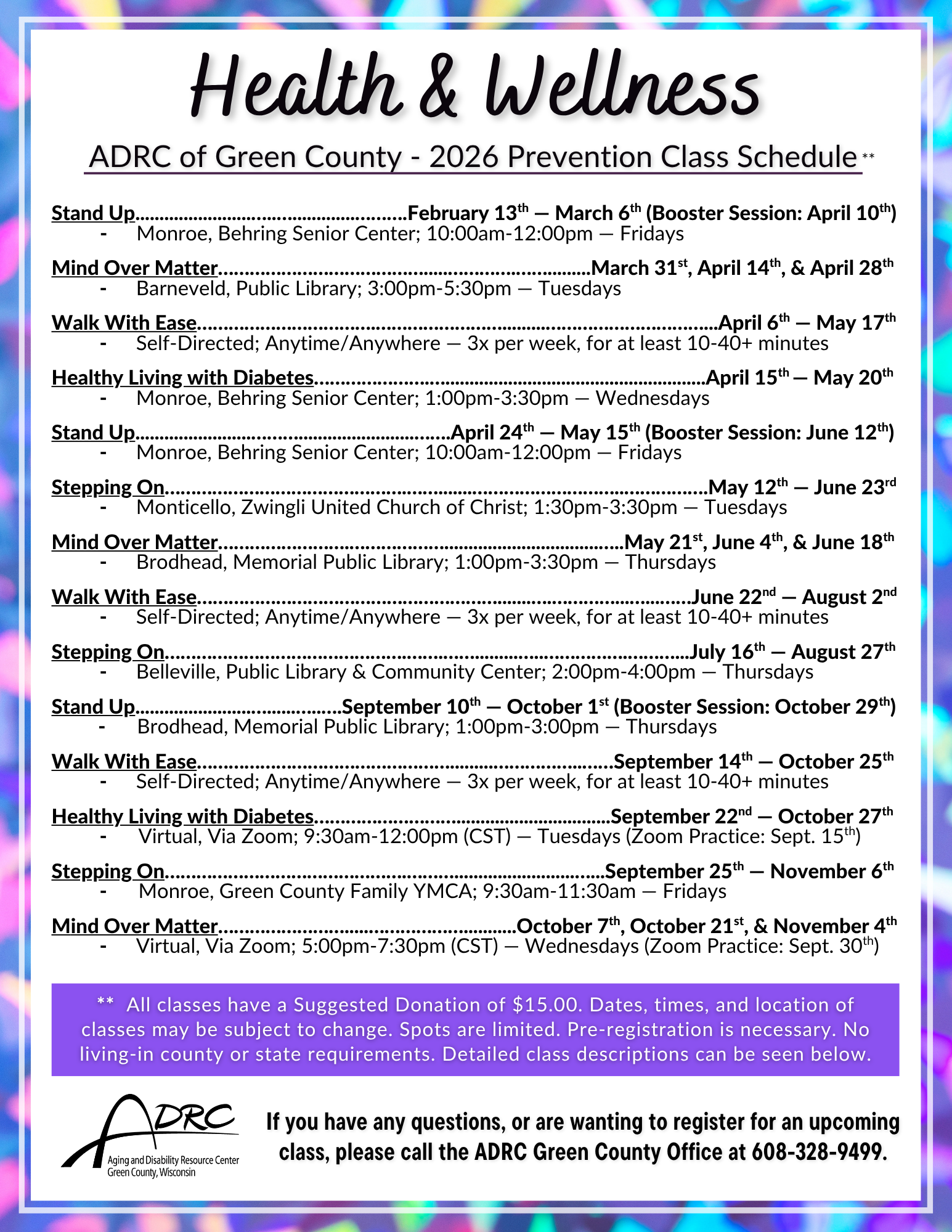 Health and Wellness classes happen regularly throughout the communities in Green County. To stay up-to-date, and to see what classes and other events are being offered, you can check out our Events Calendar by clicking HERE.